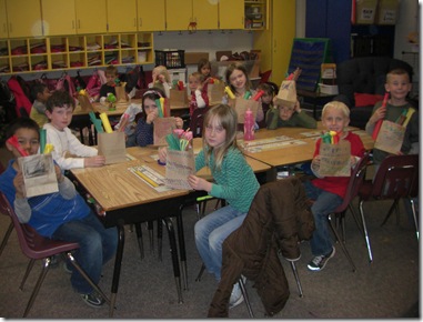 We made and decorated our own pottery bowls from a paper sack and rolled up colorful paper to make paintbrushes like the ones Little Gopher used in the story.  CIMG1533CIMG1535 CIMG1537 CIMG1540CIMG1543